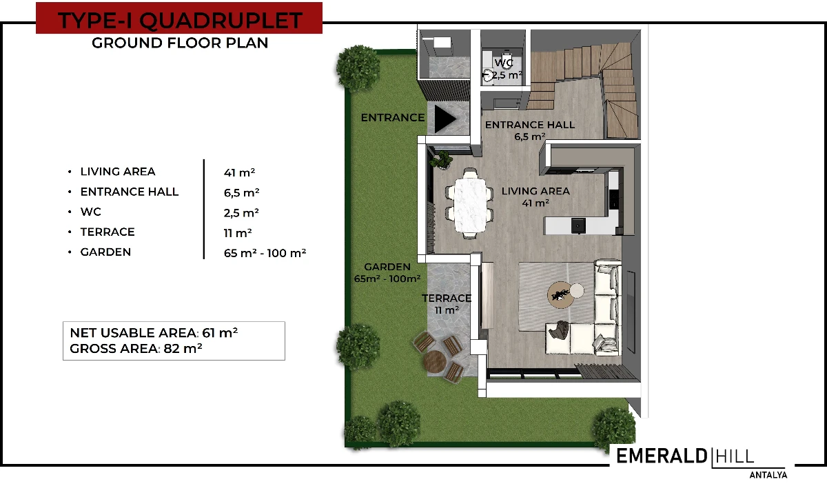 There are 32 quadruple villas in 8 blocks, each with a net area of 172 m² and a gross area of 242 m². These villas offer a comfortable and luxurious lifestyle with their spacious interiors and special landscaping. They also provide residents with a shared swimming pool, private gardens, covered parking, and private security.