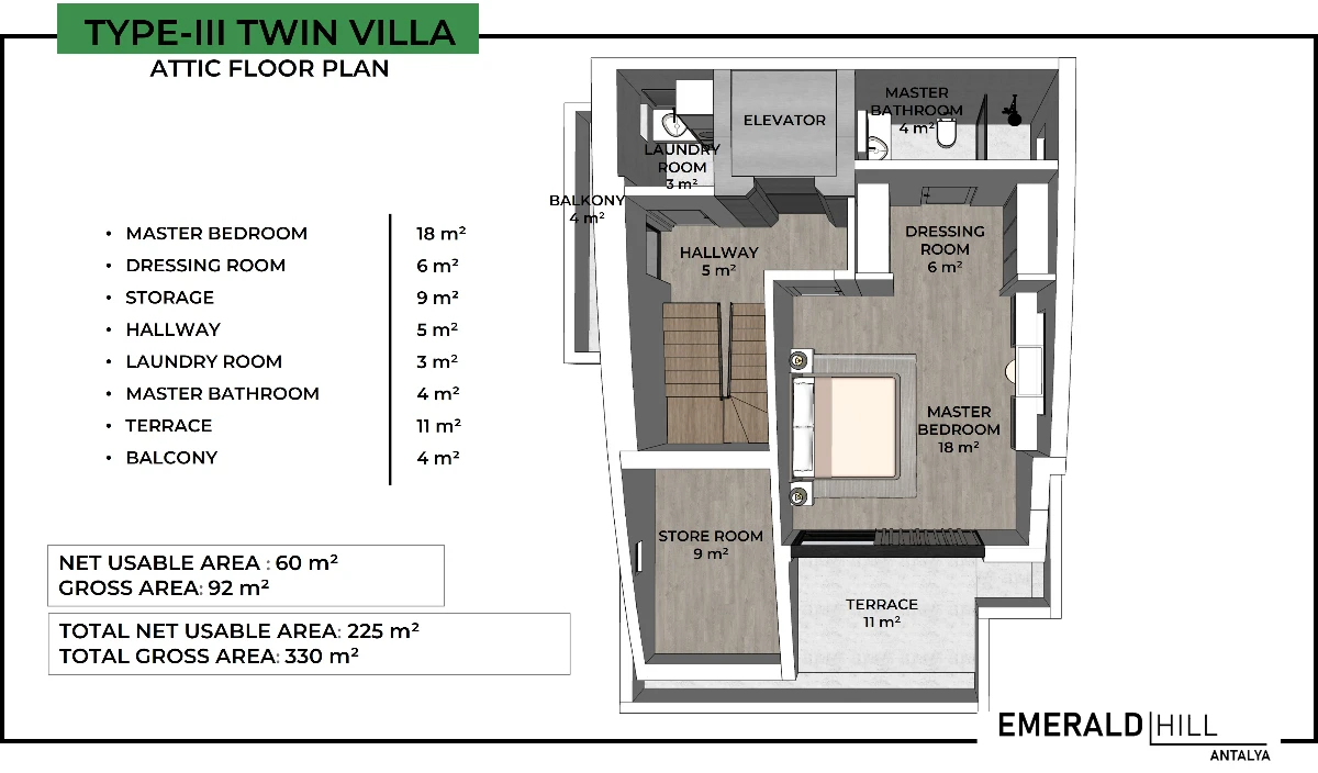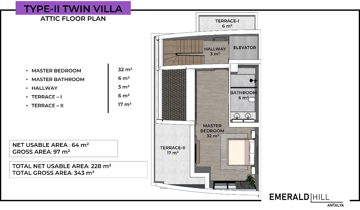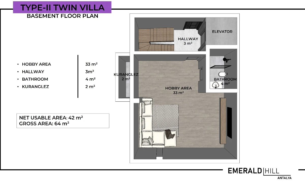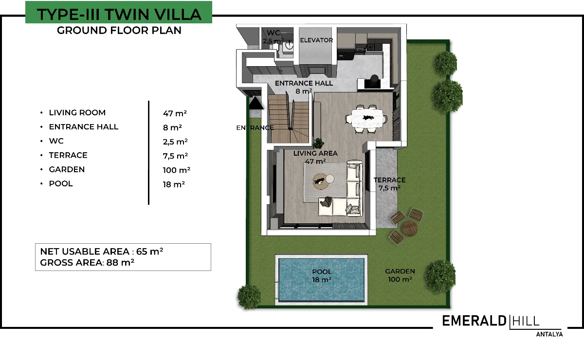 Emerald Hill Antalya Villas is a prestigious project located in Konyaaltı-Zümrüt Mahallesi, just a few minutes from the sea. The project is built on a total area of 7,895 m² and has a construction area of 12,680 m², offering 42 independent villas in 13 blocks. Each villa is designed with a modern aesthetic and spacious living areas to meet the needs of families. The villas feature numerous luxury amenities, including a shared outdoor swimming pool, private gardens, covered parking, and private security.