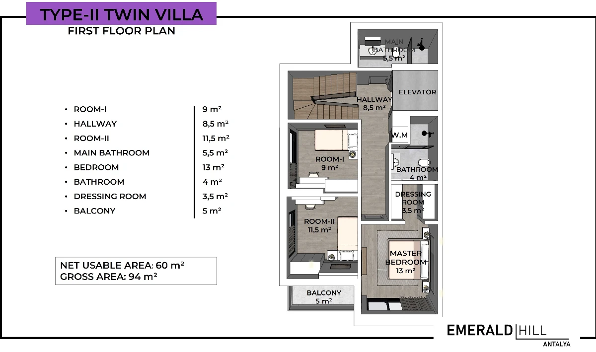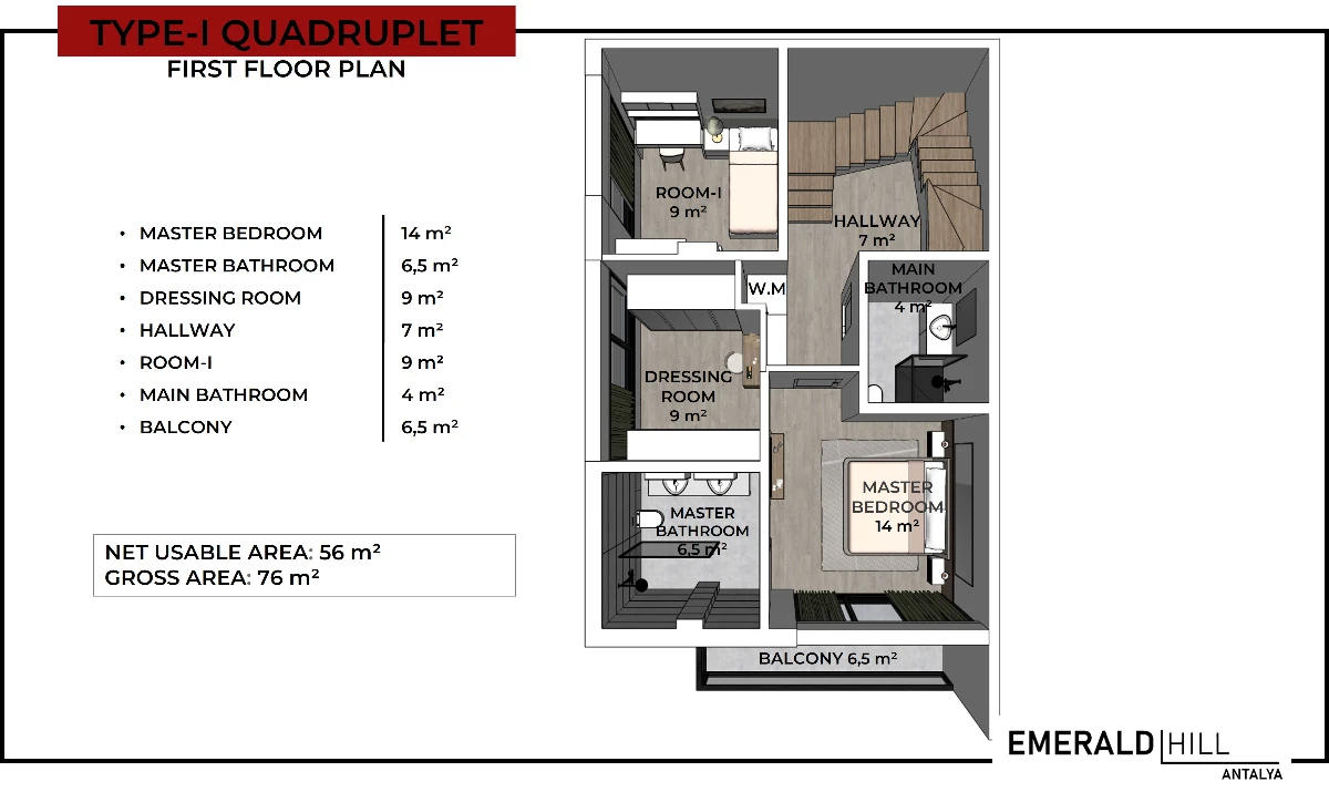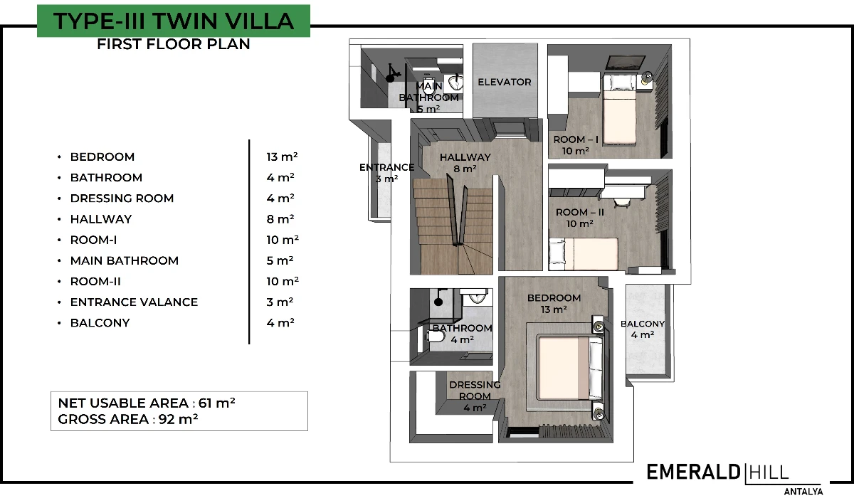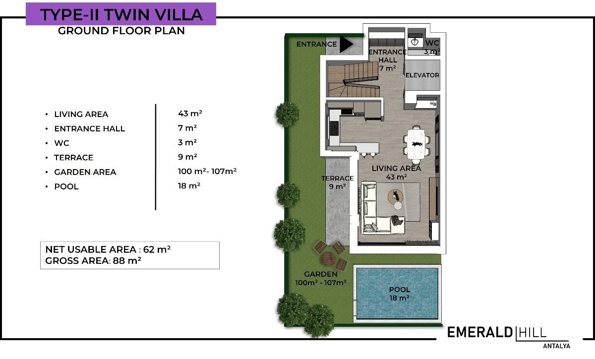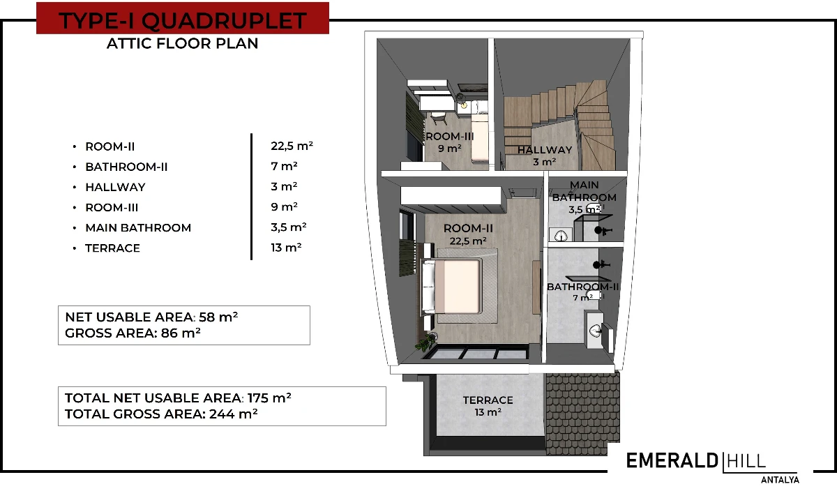 Emerald Hill Antalya Villas is a prestigious project located in Konyaaltı-Zümrüt Mahallesi, just a few minutes from the sea. The project is built on a total area of 7,895 m² and has a construction area of 12,680 m², offering 42 independent villas in 13 blocks. Each villa is designed with a modern aesthetic and spacious living areas to meet the needs of families. The villas feature numerous luxury amenities, including a shared outdoor swimming pool, private gardens, covered parking, and private security.
